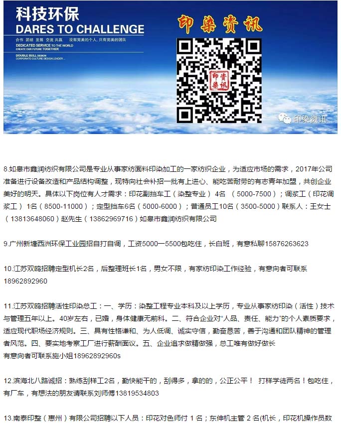 重点招聘│肇庆鼎晟纺织染整,高薪招针织厂厂长,针织面料销售业务员