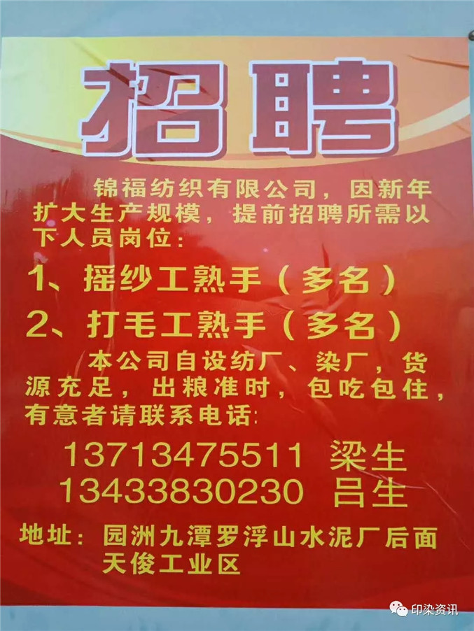 2/19 惠州园洲星光纺织招看缸师傅2名,杂工1名,主做全涤,T/C针织布。有意联系13712395693邓生。(正月十八开工)