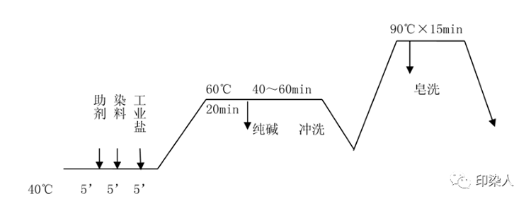 活性翠蓝染色时,可在常温加料,加碱固色,然后升温到60℃染色。也可高温染色(85~90℃)再降温(70℃)加碱固色工艺,具体工艺可根据工厂自身条件而定。