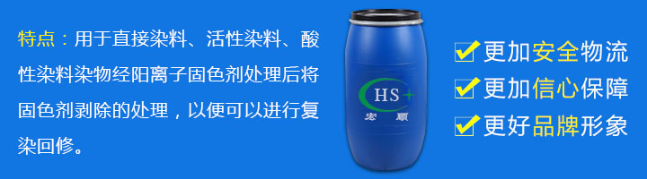 用于直接染料、活性染料、酸性染料染物经阳离子固色剂处理后将固色剂剥除的处理,以便可以进行复染回修,其特点如下: 1、优良的分散能力,超强的除固效果 2、液态,无起泡性,可在溢流染色机中处理,特别适合于自动计量设备 3、洗除、剥离浮色染料,提高色泽的亮艳度 4、有效消除硬水沉淀物 5、处理后产品耐光性无影响。【使用方法】