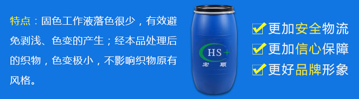 1、固色工作液落色很少,有效避免剥浅、色变的产生; 2、经本品处理后的织物,色变极小,不影响织物原有风格; 3、经处理后的织物,摩擦牢度、皂洗牢度、汗渍牢度等显著改善; 4、突出的耐碱性能,可用在棉固色后丝光工艺。 5、不含甲醛,符合环保性能; 6、耐氯漂;