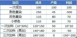 剥色重染,成本在250%,产能在45%,利润-300%;