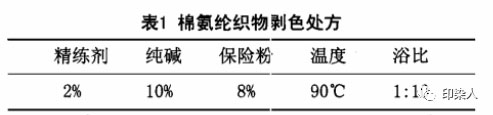 棉织物剥色一般采用保险粉-烧碱法,而对于棉氨纶织物来说,由于其中含有3%~5%的氨纶纤维,氨纶不耐强碱,尤其在高温条件下,烧碱对氨纶起分解作用,故棉氨纶织物整理加工需尽量降低烧碱浓度,且温度不宜过高。生产中常常采用纯碱代替烧碱,由于碱性较弱,对氨纶作用较为缓和。剥色处方见表 1。