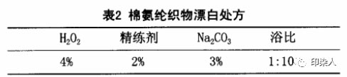 织物经剥色后往往白度不够,达不到染色要求。剥色后重染浅色时,对织物的白度要求更高。因此,织物剥色后漂白会得到较好的白度。因织物中含有氨纶,氨纶纤维在次氯酸盐溶液中会以氮一氯结合而使纤维损伤泛黄,损伤严重。所以对含有氨纶的织物漂白不可用含氯漂白剂。而氨纶对含氧漂白剂有较好的稳定性,但溶液中过氧化物浓度不可过高。同样,考虑到烧碱会对氨纶纤维有较大损伤,故漂白时采用纯碱,作用较为缓和,织物弹性不会有明显影响。漂白处方见表2。