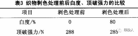 棉氨纶弹性织物经过上述剥色漂白工艺处理后,由于织物本身具有较大弹性,且剥色、漂白时用纯碱代替烧碱,作用较为缓和,织物弹性和强力没有明显影响。剥色处理前后织物顶破强力及白度的测量平均值见表3。