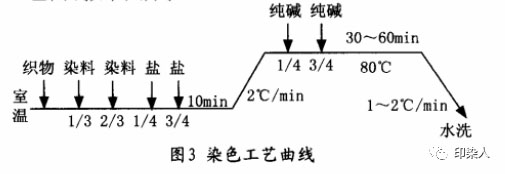 染色采用溢流染色机或喷射溢流染色机,复染时染料按原处方增加15%,其它助剂用量及工艺条件不变。织物经过剥色漂白处理后比未染色、未剥色的半制品更白,因此复染需增加染料浓度。染色工艺曲线如图3。
