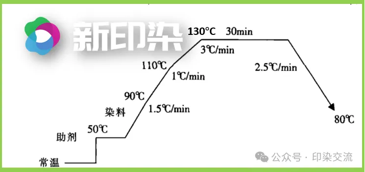 要正确控制升温速度,当染色温度在85℃以下时,染料很少上染,可直接升温。90~110℃是上染速度增加最快的温度区域,需要严格控制升温速度在l℃/min以下。115~135℃范围内可稍快点,但需要将升温速度控制在3℃/min左右。