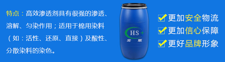 高效渗透剂具有很强的渗透、溶解、匀染作用;适用于棉用染料(如:活性、还原、直接)及酸性、分散染料的染色。