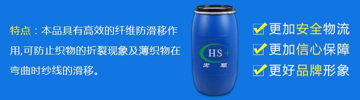 本品具有高效的纤维防滑移作用,可防止织物的折裂现象及薄织物在弯曲时纱线的滑移,而不影响手感。极大的改善纱线抗滑移性和缝纫强度,减少起球倾向。