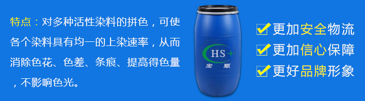 1、对多种活性染料的拼色,可使各个染料具有均一的上染速率,从而消除色花、色差、条痕、提高得色量,不影响色光。具有较强的分散作用,极佳的匀染、剥色效果,对工作浴中的金属离子有螯合分散作用,有效防止染料凝聚,并有极好的复染性。能促进染料之均匀吸收及渗透,减少浮色,节约染料;