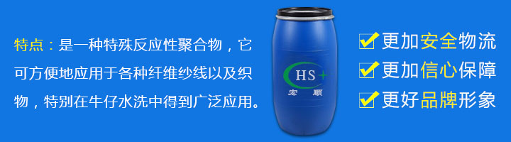是一种特殊反应性聚合物,它可方便地应用于各种纤维纱线以及织物,特别在牛仔水洗中得到广泛应用;其能赋予织物光亮性、悬垂性,回弹性,超松、超软、超滑的手感,烘干后不粘手,并具有耐水洗和干洗的效果,效果特佳,洗后具有丝般的光泽,按常规整理工艺应用对织物,纱线的白度,色牢度没有影响。无毒、不含APEO、NPEO符合环保标准